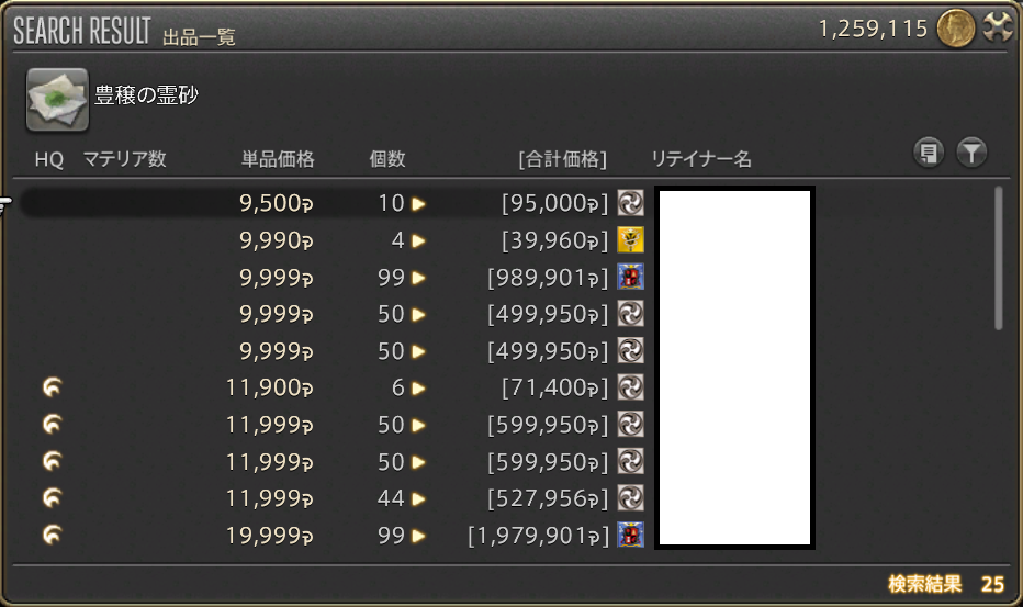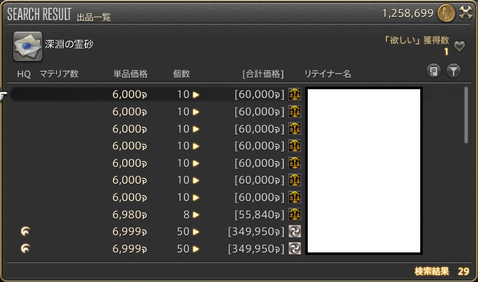 ちなみにですが、最近追加された黄昏の霊砂はNQ3,500G、HQ4,000Gと、かなり安めです。まあこちらも一応集めておきます。