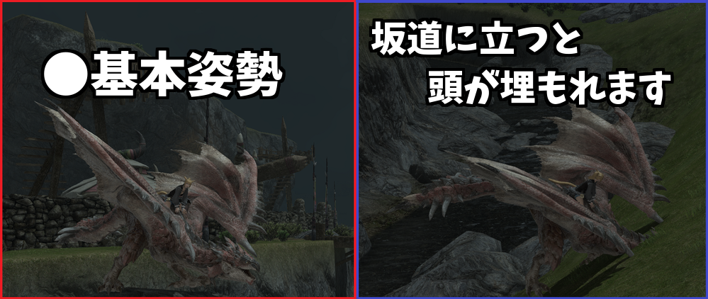 上の画像を見てもらえれば分かるんですけど、坂がある場所だと頭が埋まるんですよ。せめて、走ってる最中とかならこの体勢では良いとは思うんですが、立ってるだけの基本体制は、もうちょい頭の位置を高くしても良かったのでは?と思ってしまう。