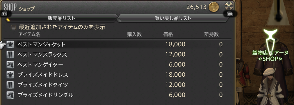 今回のお題に対して「安価で済ます」にはどうしても胴と脚装備を準備する必要がありますから、難しいのかな?ウルダハ・ナル回廊のNPC「織物店リアーヌ」にスーツは売っていますから、マーケットの値段と見比べて買ってくださいね!