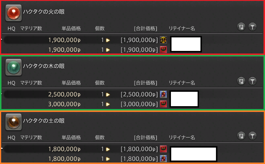 主に高いのはこの3つの眼ですね。炎の眼は、私が買った際もこのくらいだったんですが、木の眼と土の眼の値段は2倍近く値上がりしています。この3つ買うだけでも約600万Gですよ。後、これに金の眼(2,000G)と水の眼(80万G)を買い揃えるとして、総額約700万Gもお金がかかっちゃいますね。